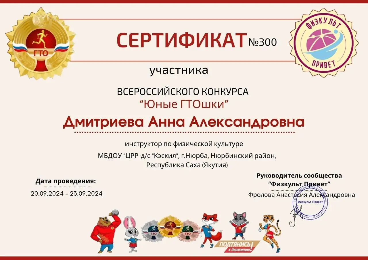 С 20 по 23 сентября 2024 года в сообществе ВК «Физкульт Привет» наш инструктор по физкультуре Анна Александровна участвовала во Всероссийском дистанционном конкурсе для педагогов «Юные ГТОшки». В нем участвовали 390 детских садов из разных уголков нашей России. Из Республики Саха (Якутия) участвовал наш «Центр развития ребёнка — детский сад «Кэскил».